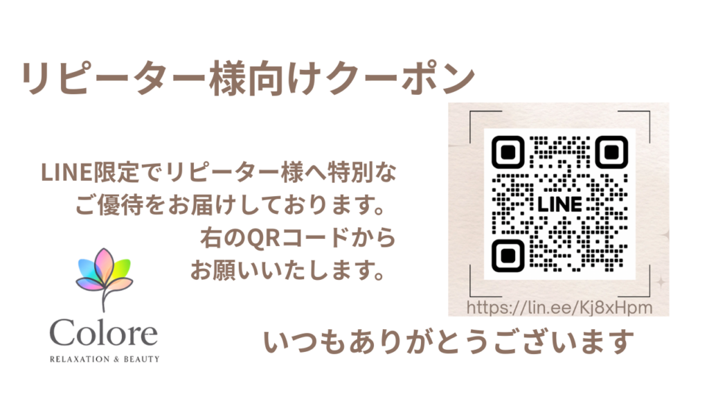 「お肌に彩りを感じ、お身体に彩りを感じる」 上質なひとときを、ぜひ Colore(クロレ) で ご体感ください。 私たちは、お客様の心と身体を やさしく満たし、 自然と笑顔があふれる・・・ そんな温かな空間でありたいと願っております。 ボディケアやアロマテラピー、 フェイシャルトリートメント、 全身をケアする多彩なメニューを ご用意しております。 落ち着いた個室空間で、 お一人おひとりに合わせた 特別な時間をお楽しみください。 さらに当サロンでは、 世界中で高い評価を受ける スキンケアブランド 「クリスティーナ」 を取り扱い、 肌質改善を目的とした上質な フェイシャルトリートメントをご提供しております。 お肌の美しさを引き出し、 心と身体に彩りを添える贅沢な時間を お届けいたします。 当サロンは、神戸の三宮駅(JR/阪神)より 徒歩3分の場所にございます。 お仕事やお買い物のお帰りの際などにも お寄りいただけましたら幸いです。 この度は当ホームページをご覧いただき 誠にありがとうございます。 皆様のご来店をスタッフ一同心より お待ちしております。