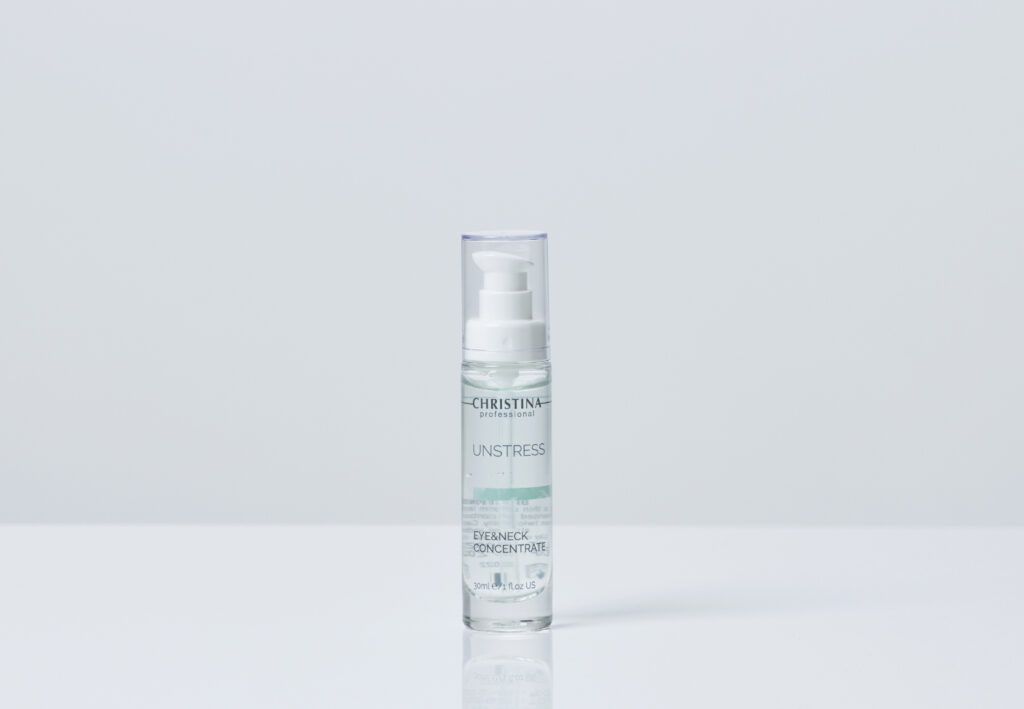 目と首の保護のための美容液。カフェイン配合で目元の循環を改善し炎症とクマを軽減します